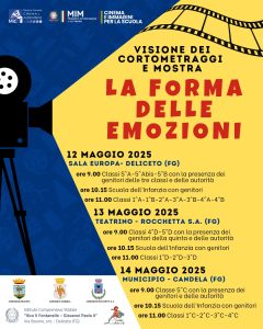 Nelle date del 12 maggio (Deliceto), 13 maggio (Rocchetta Sant’Antonio) e 14 maggio (Candela) avranno luogo gli eventi finali del progetto “La forma delle emozioni”. Saranno occasioni speciali per celebrare il talento e la creatività dei nostri giovani e il percorso di educazione all’immagine che hanno intrapreso.